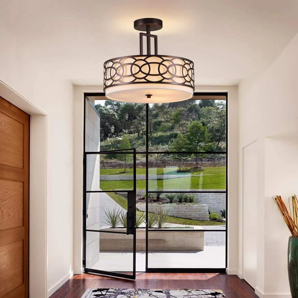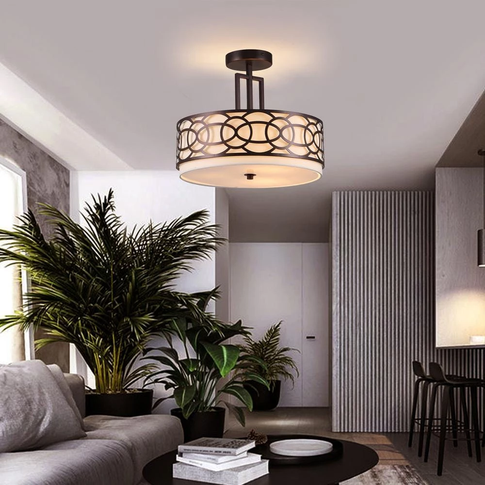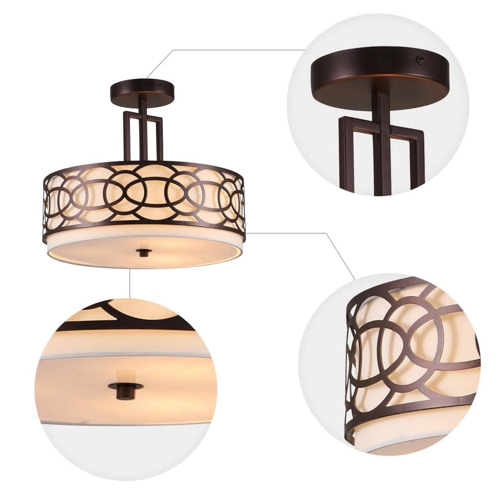 This semi flush mount light features an oil-rubbed bronze finish that will complement many contemporary and modern decors. This piece would look great in the dining room, hallway, and foyer. This fixture takes three 60-Watt E26 bulbs and is compatible with fluorescent, incandescent, and LED bulbs. The shade strikes a drum-shaped silhouette with a white cotton inner shade and geometric overlays, while a frosted acrylic diffuser spreads bright light throughout your space.