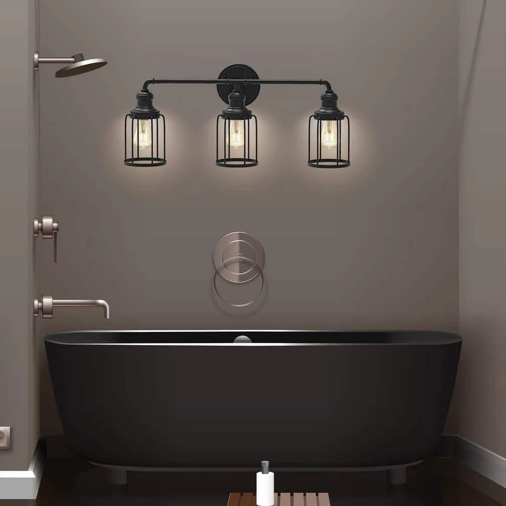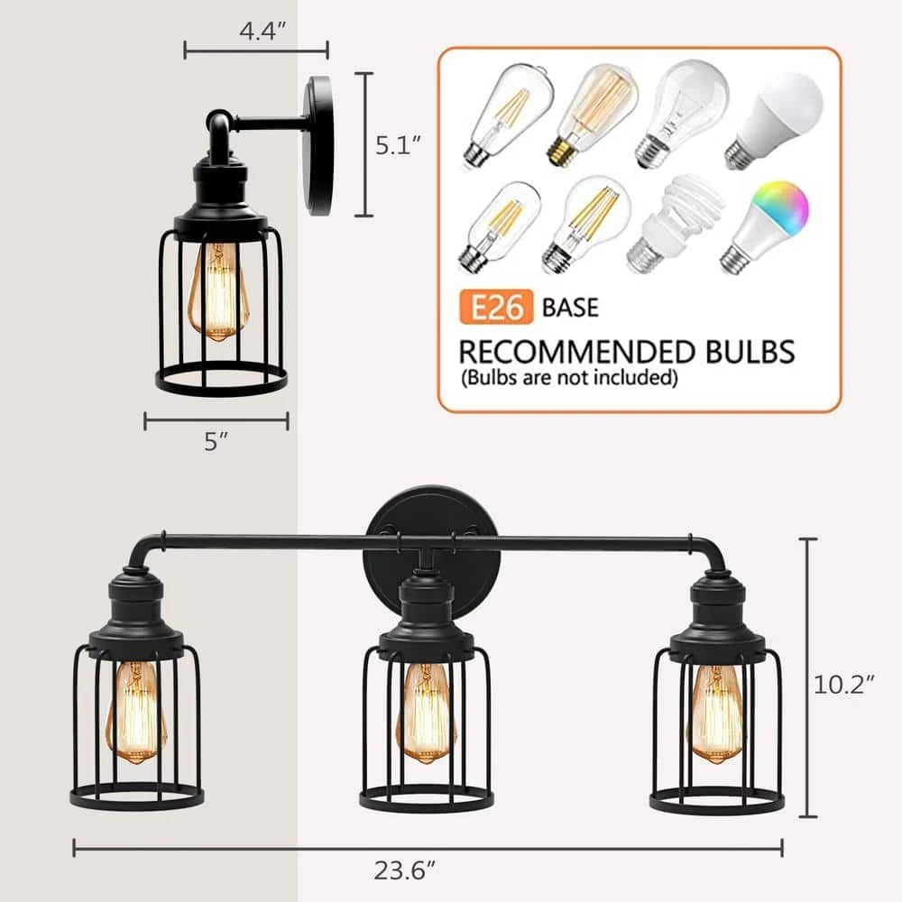 3-Light vanity light with black metal cage design has a retro look. Simple line finish perfect for any decoration style. Using anti-rust materials, don’t worry about it will fade and rust, even if it is installed in a wet bathroom. Off course, it is also a good choice for living room, bedroom, mirror cabinet and dressing table as a wall sconce.