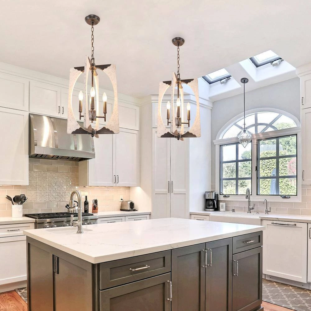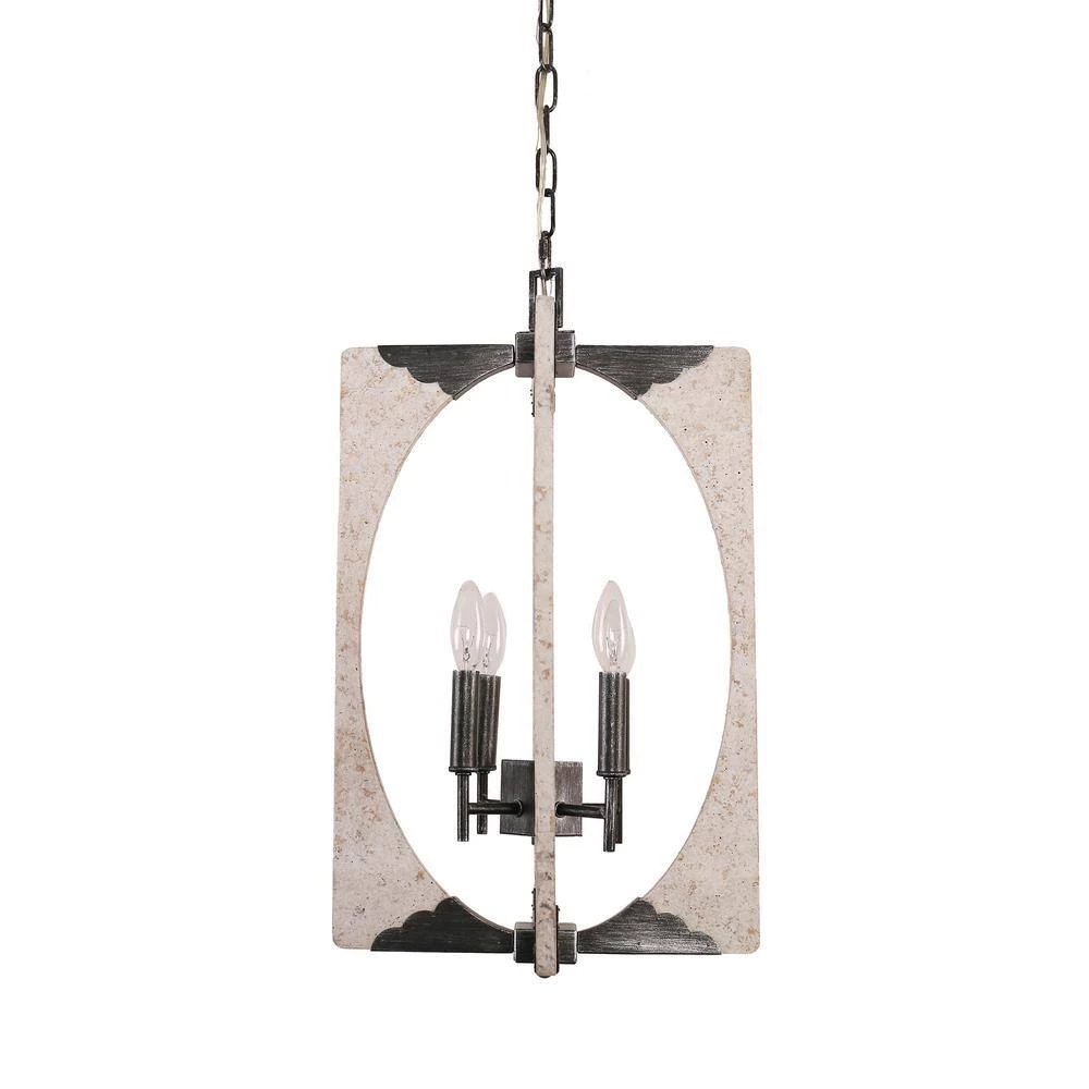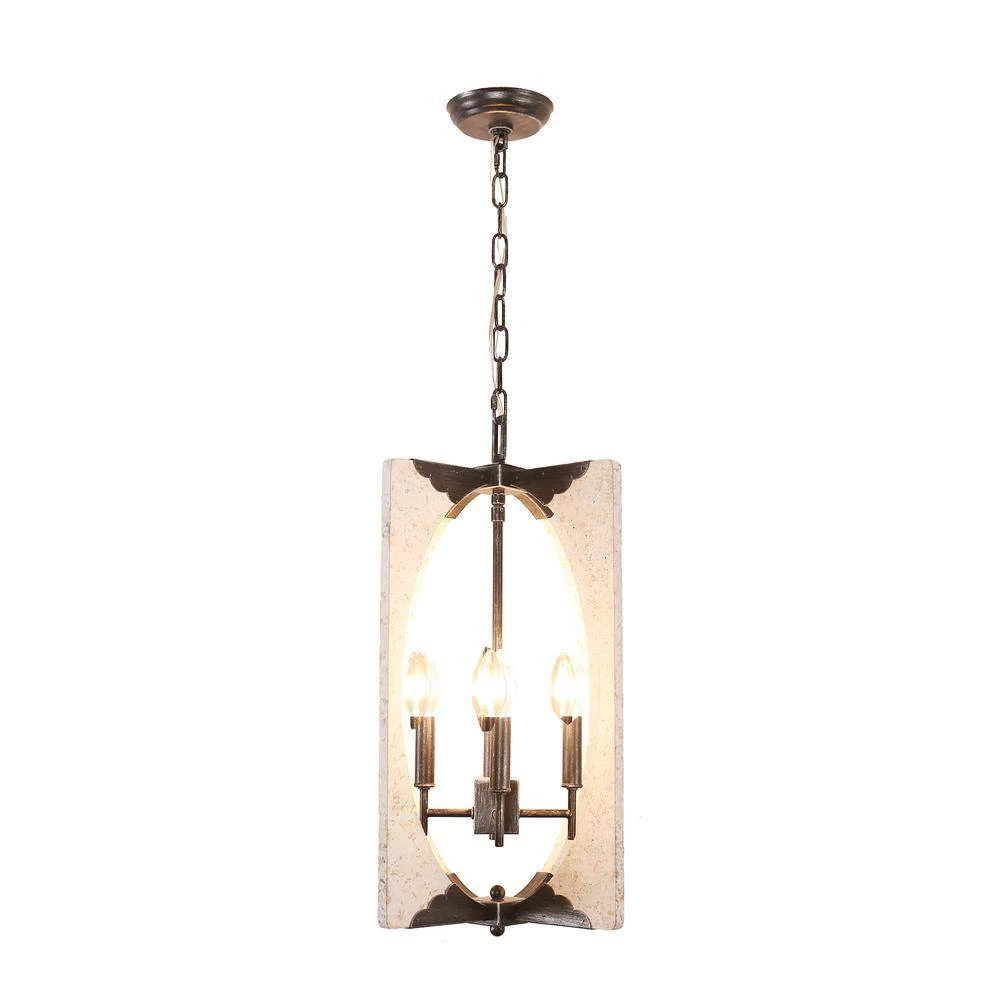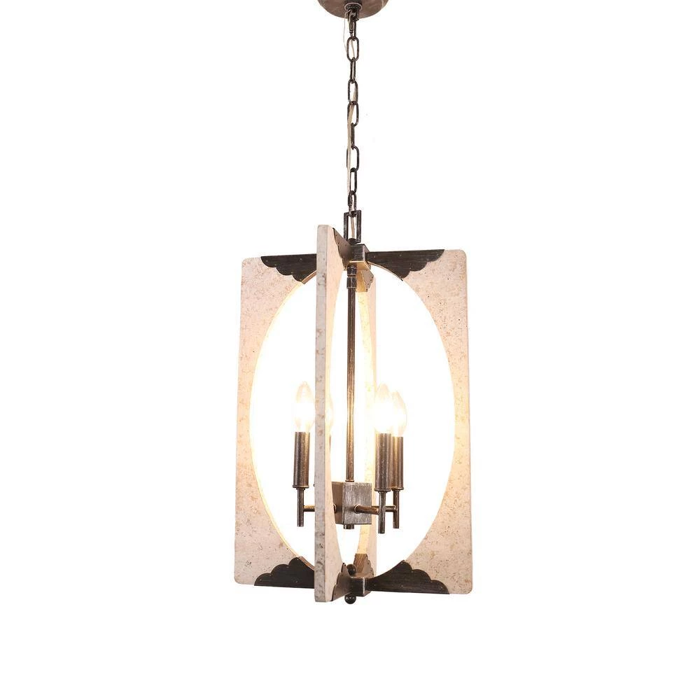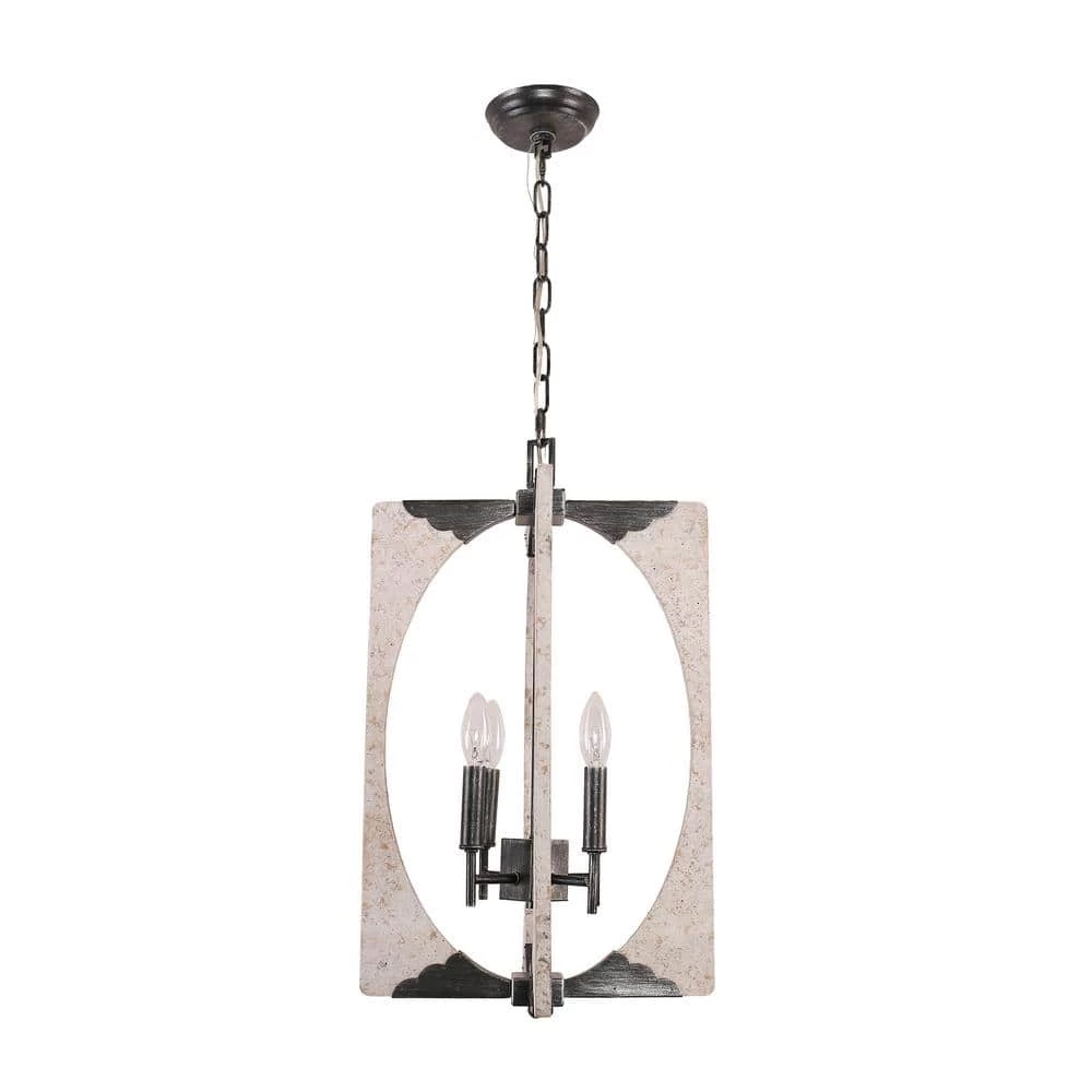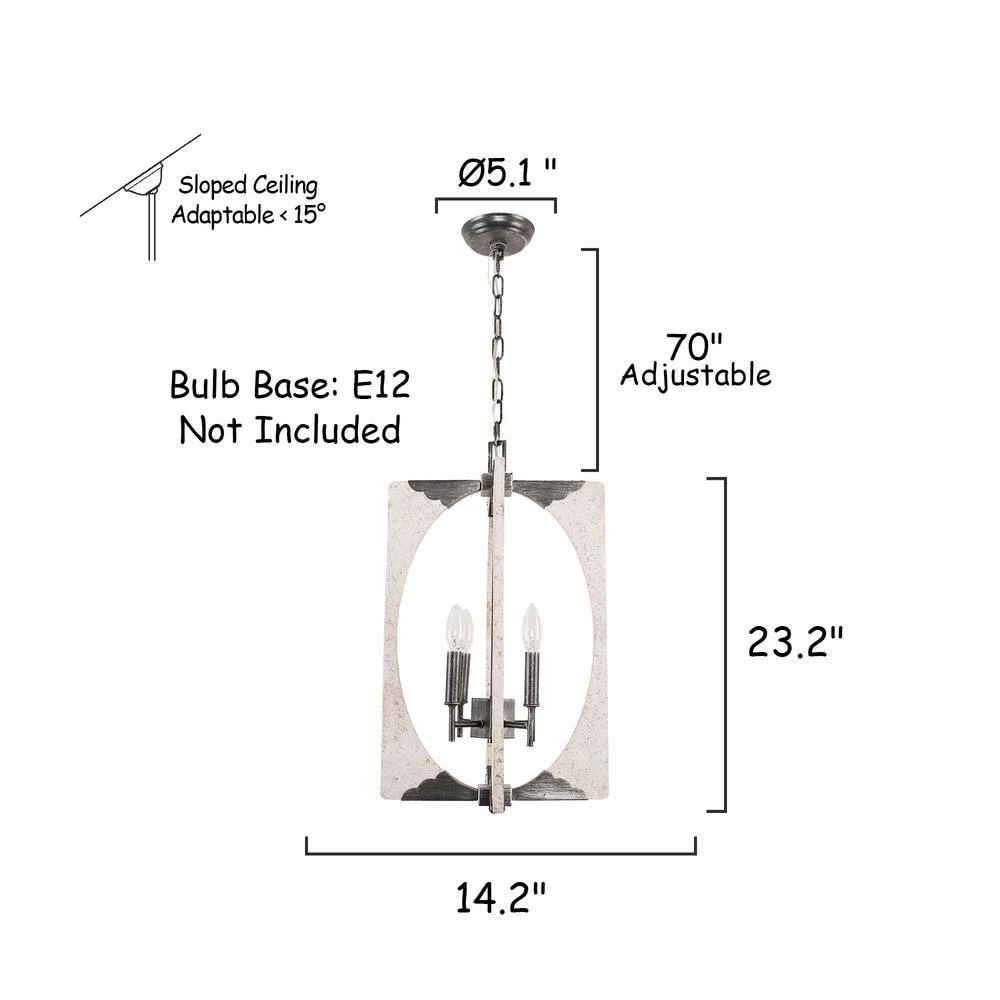 - Antique design of embedded chrome/ distressed white finish and the combination of durable rustic wood adds a chic and charming element to this chandelier, featuring square wooded frame, this 4-light candlestick pendant opens up for optimum illumination in any space, this light fixture is sure to become a statement piece in your home decor and you can easily adjust the hanging height to suit your entryway, dining room, or kitchen with an adjustable chain