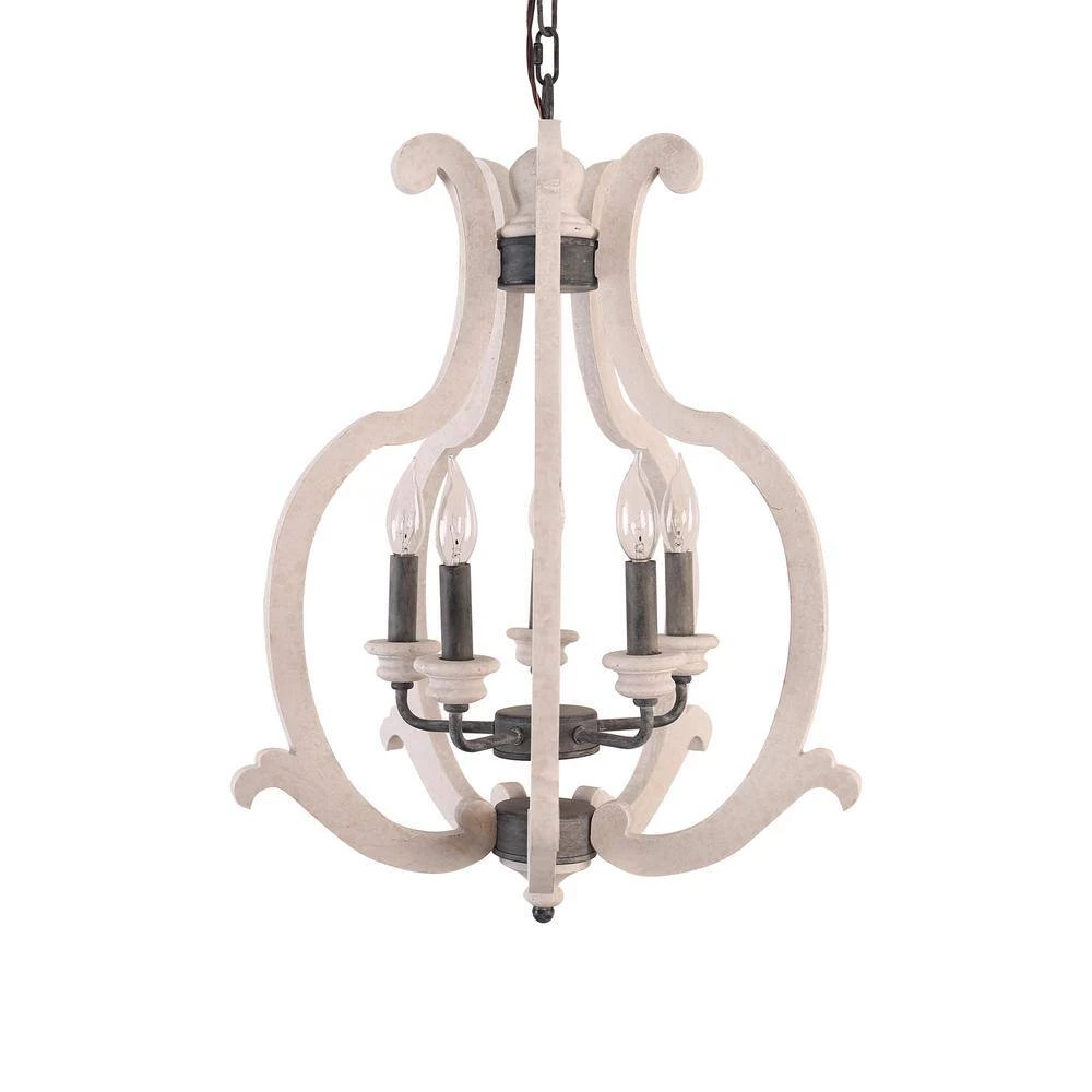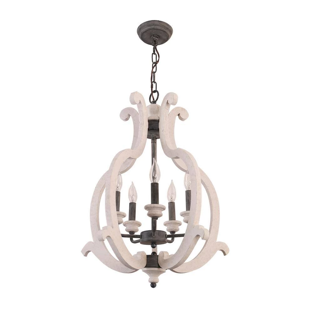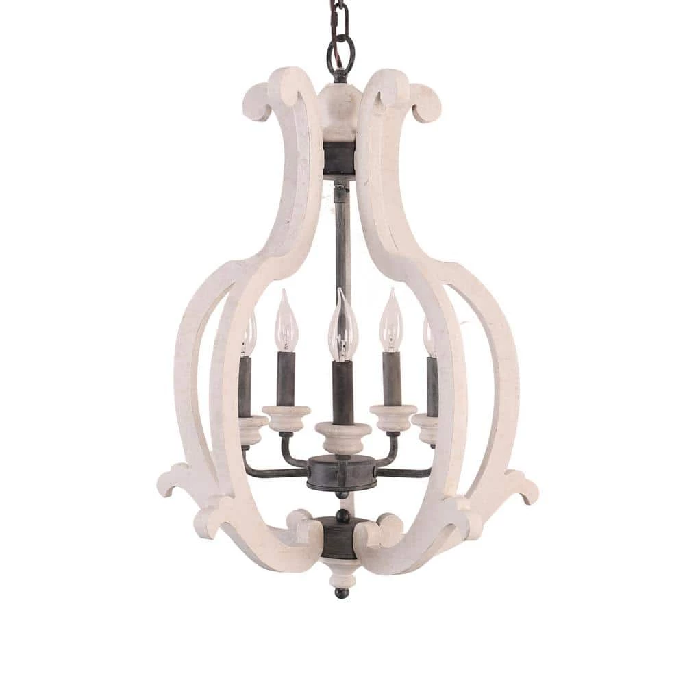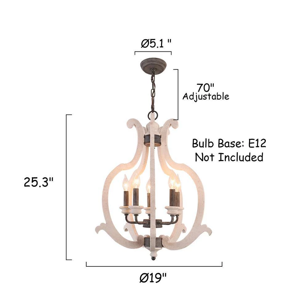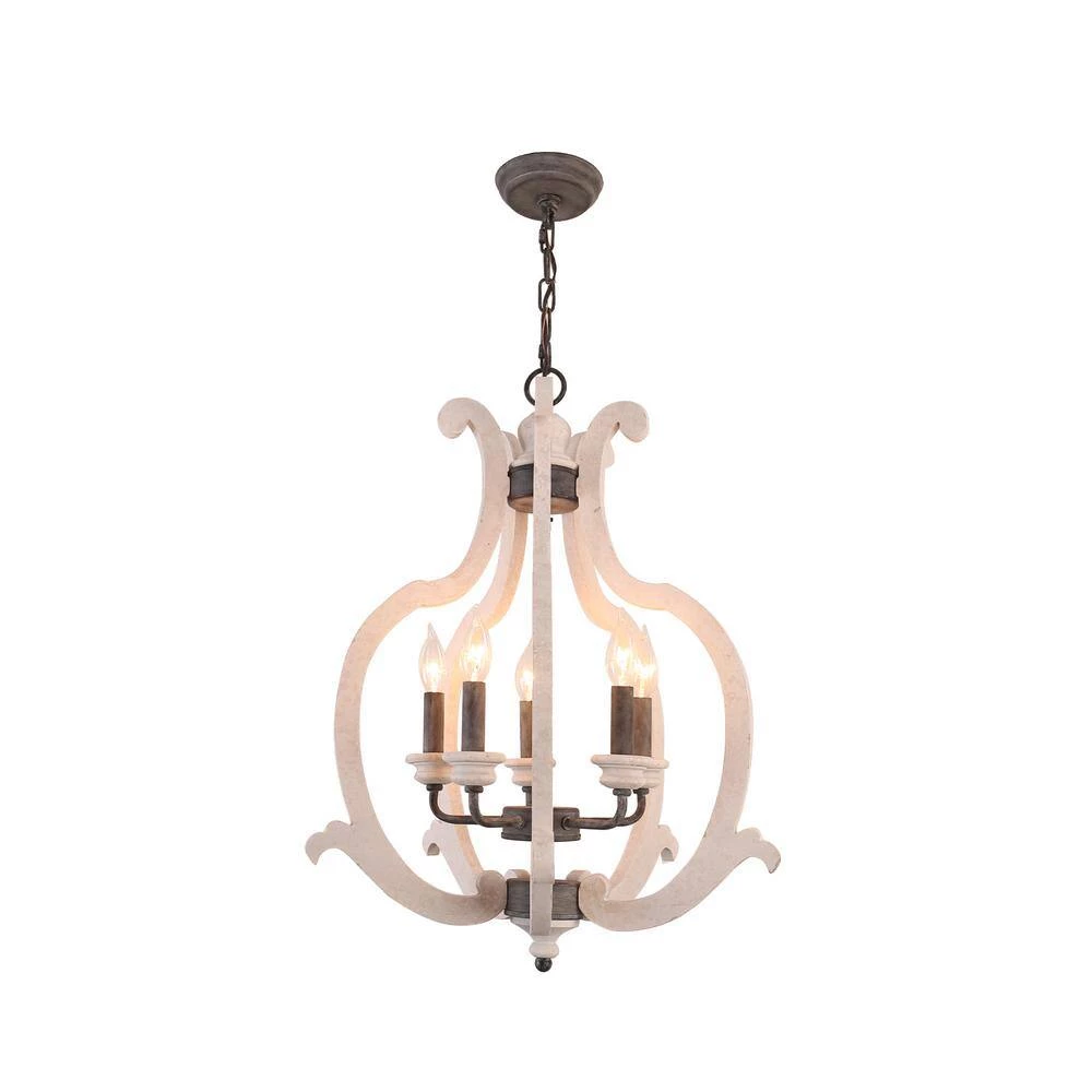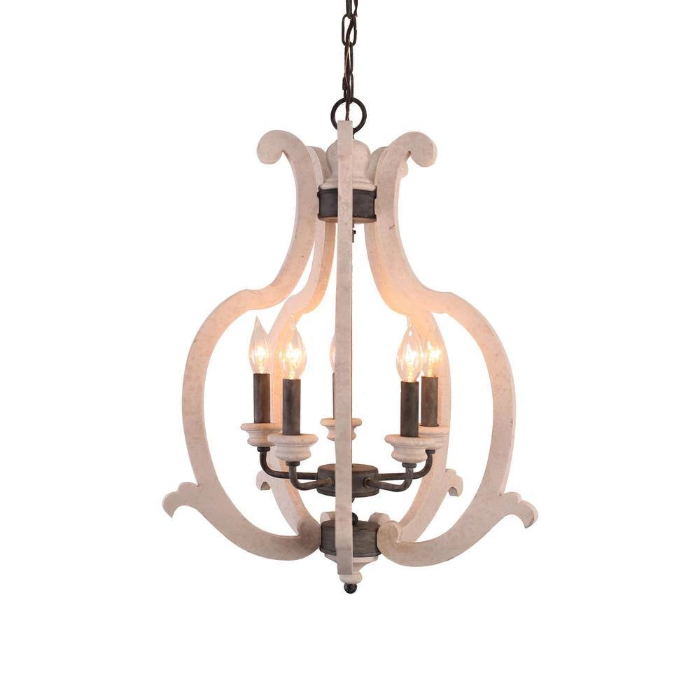 Boasting a farmhouse chic style with a distressed antique white finish, this 5-light crown wood chandelier brings cottage chic style and a refreshing feel to your home decor. A unique silhouette and unique finish give this light fixture a vintage ambiance, while the upward lighting configuration brings warm and adequate illumination to any space in your home. The candle-style design is modified in detail to cater the contemporary aesthetics without losing its antique characteristics. How wonderful it is.
