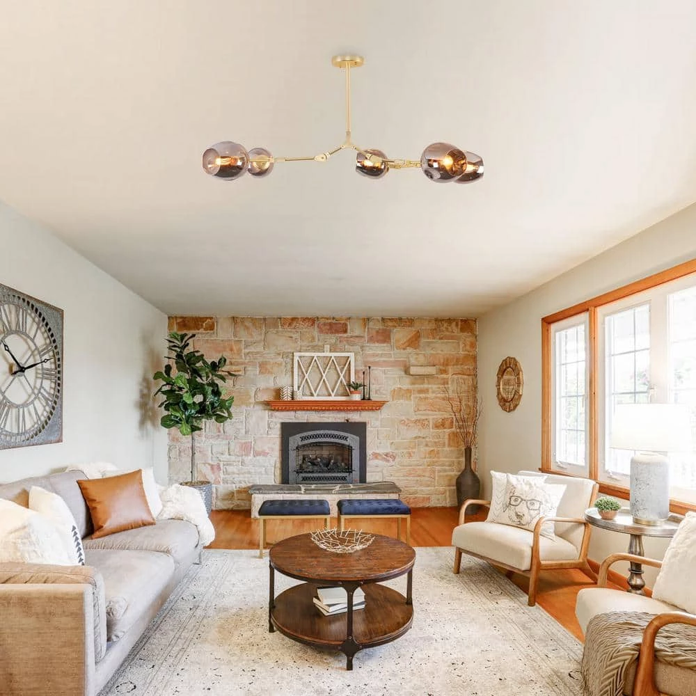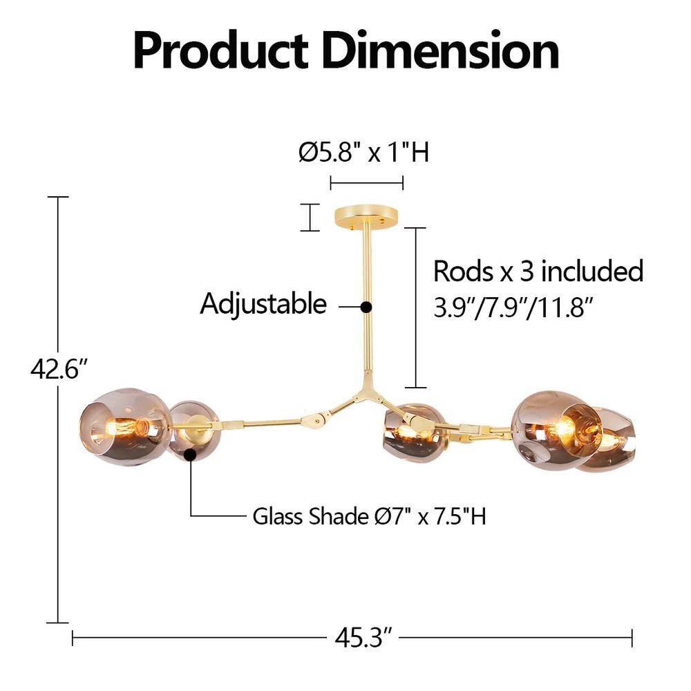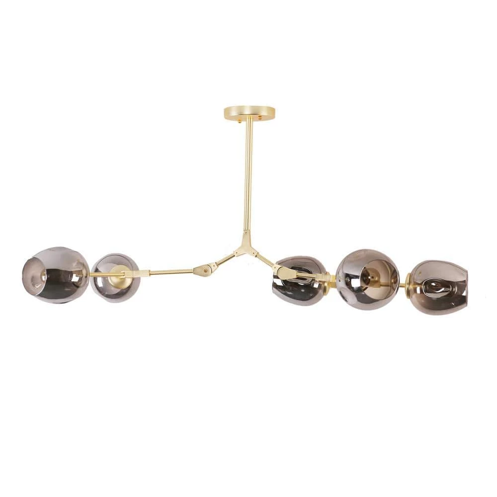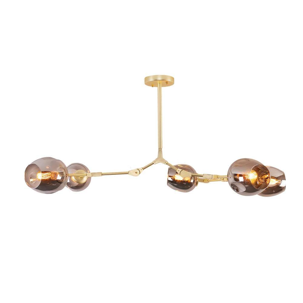 Upgrade your space and add elegant lighting with this 5-light chandelier. Glass globes suspended by gold bars offer a dazzling focal point for your decor. This modern light fixture is adorned with spherical pendants attached to linear gold rods, which bring an element of sophistication that can accentuate all styles of interior design. Its fancy design and trendy structure make it an eye-catching focal point in your room for both ambient lighting. This glass pendant light also gives you great flexibility in adjustment of each bulb inspired from the structure of molecules. You are free to choose different color shades-transparent, smoky gray, amber and blue, how wonderful it is.