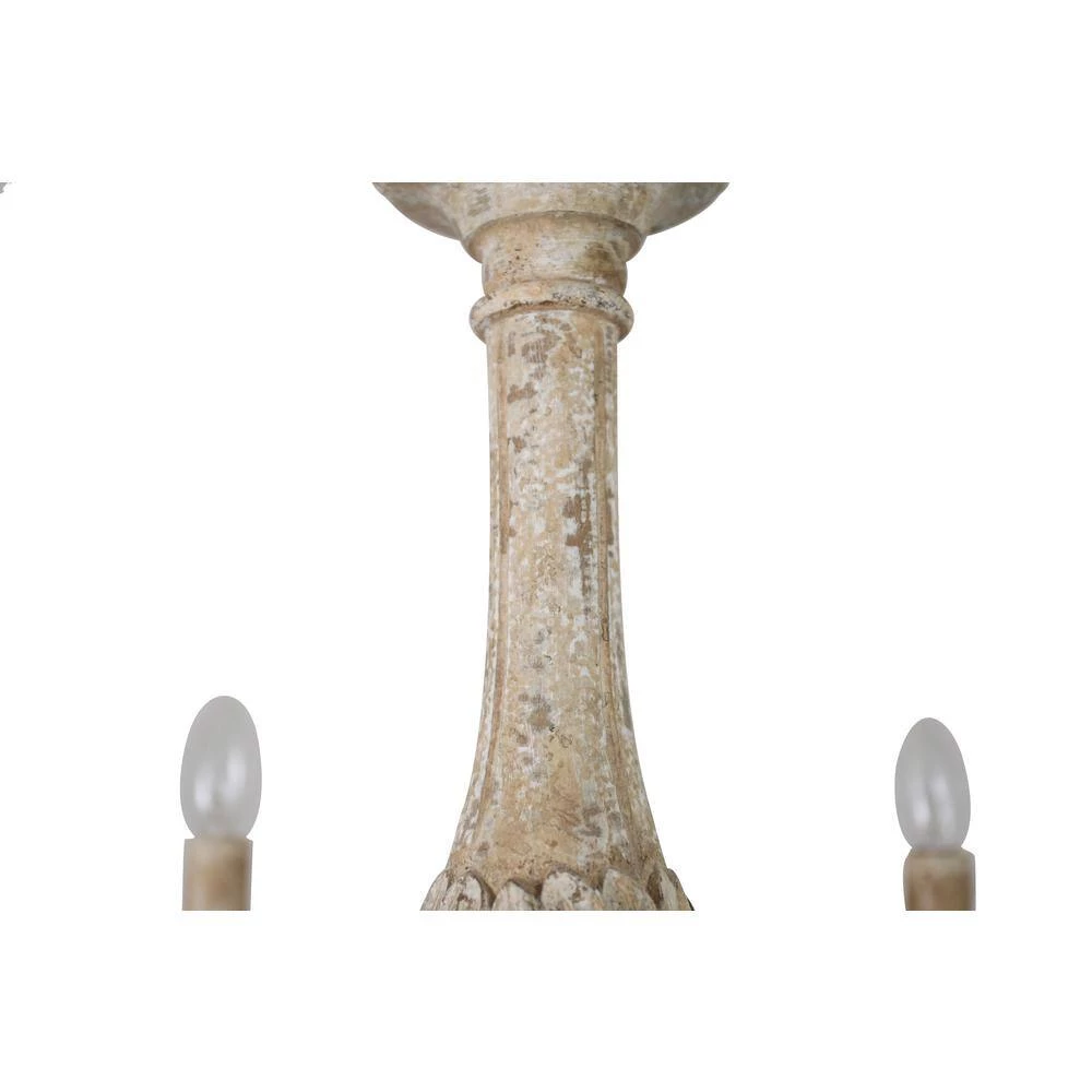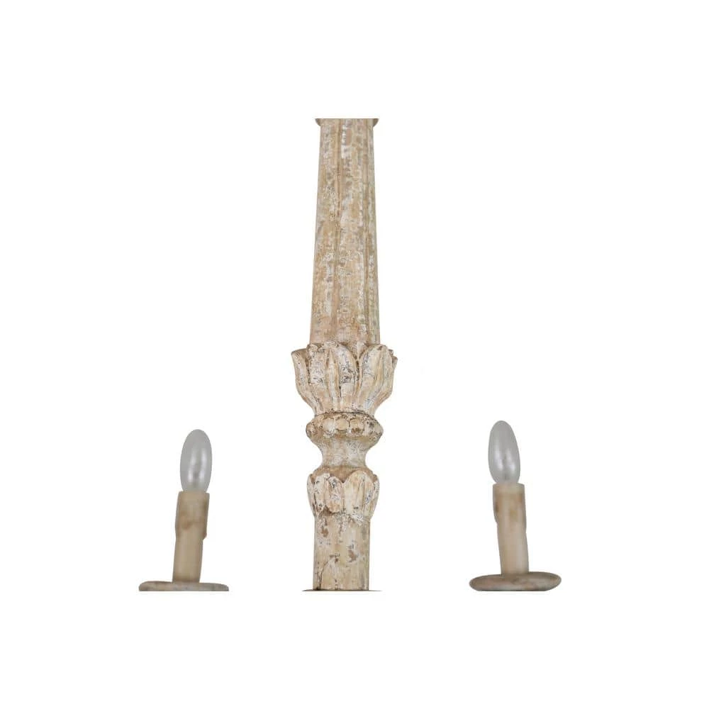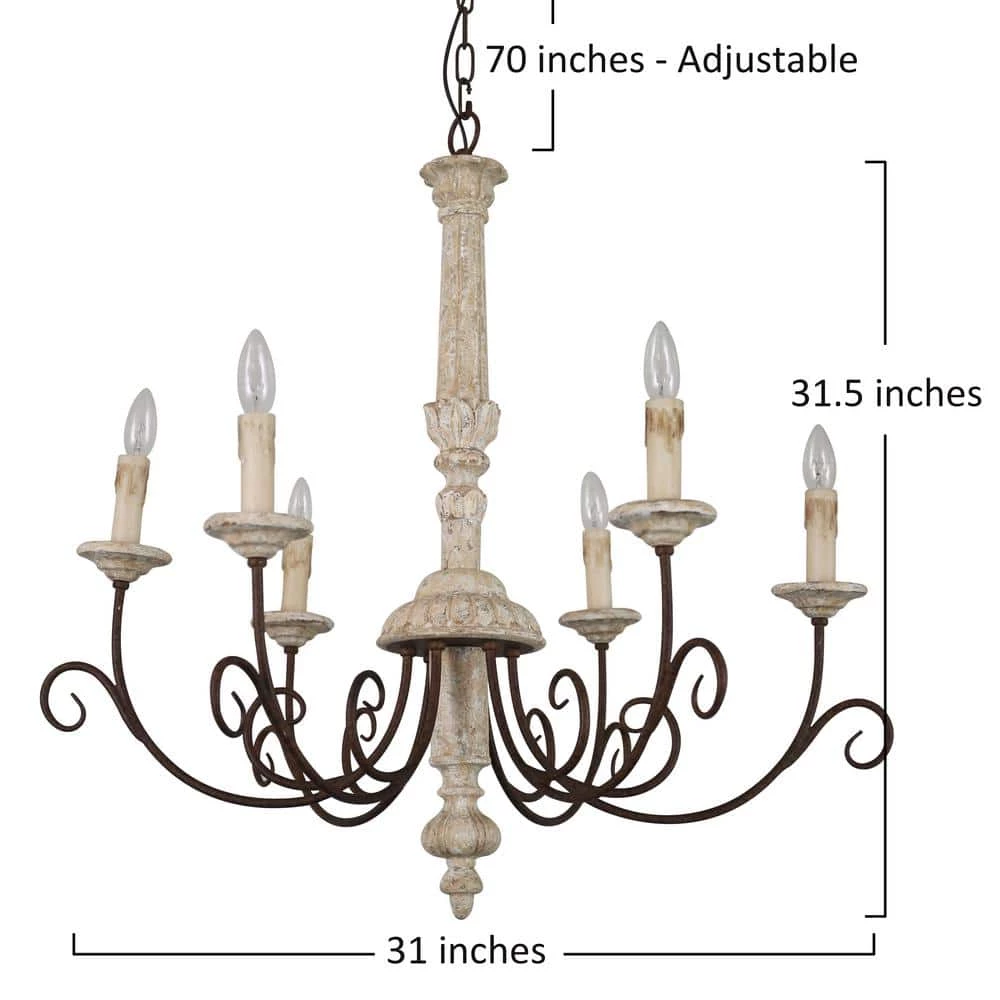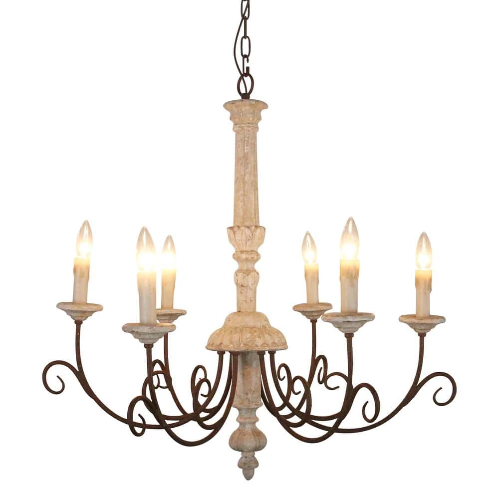 Upgrade your home with the elegant French country style. Featuring graceful iron arms, traditional upward candle holder and off-white finish, this wood chandelier pendant light is absolutely a piece of great artwork in your room. Provided with candlestick bases and 6 light bulbs (bulbs not included), it can provide adequate light to meet your lighting needs. The combination of high-quality textured wood and solid iron ensures its durability in daily use.