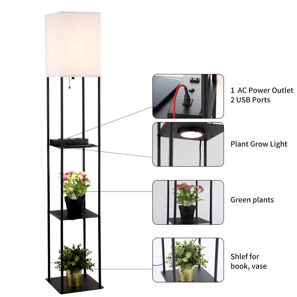 The beautiful lampshade at the top is made of high quality fabric. The lighting through the shade becomes soft and creates a cozy atmosphere at night. The second floor is equipped with plant lighting to give your plants a better environment to grow.Three levels of storage space. The shelf floor lamp has 4 tiers, each board is a plastic laminate that can carry up to 40 lbs. You can put photo frames, plants, books, or any items on it.