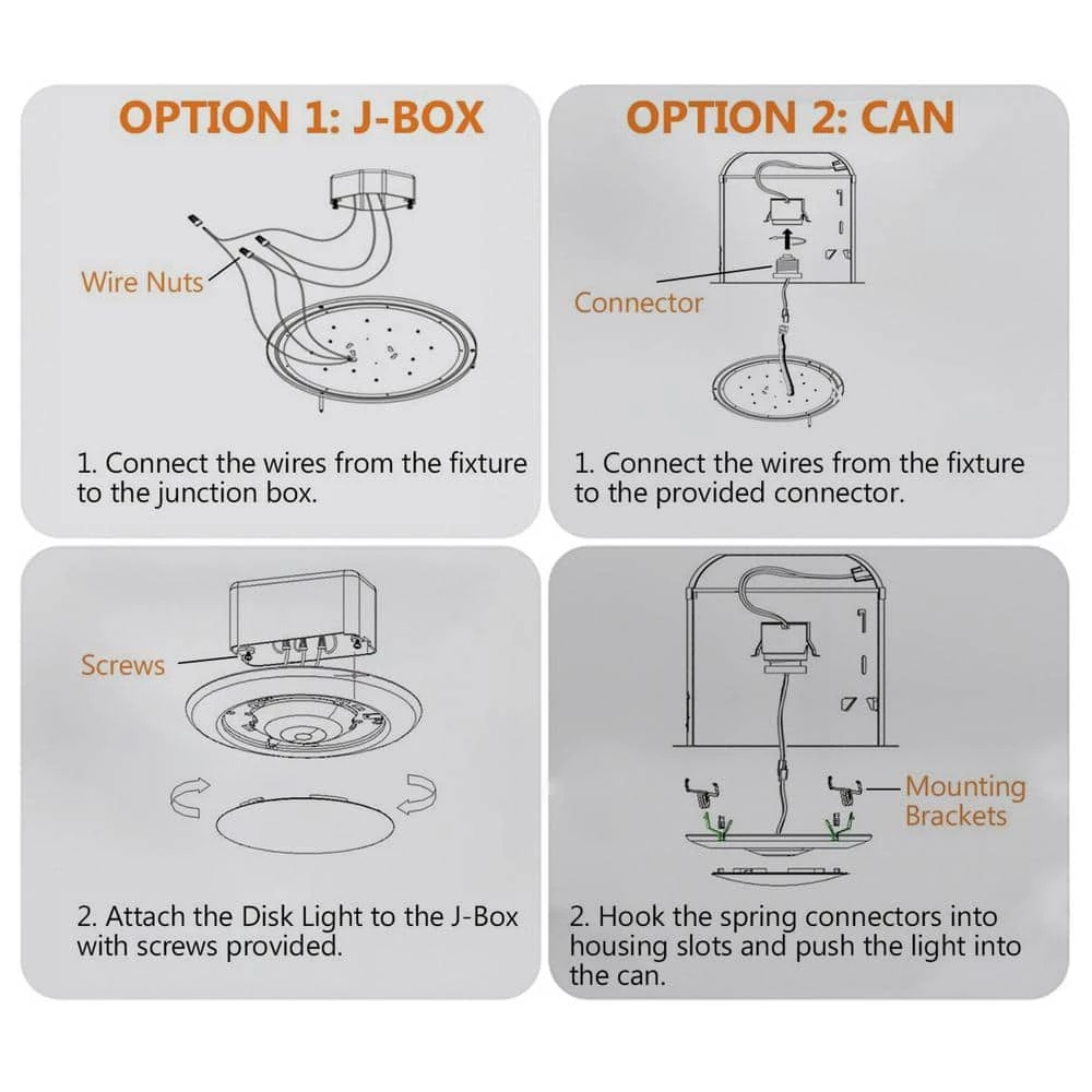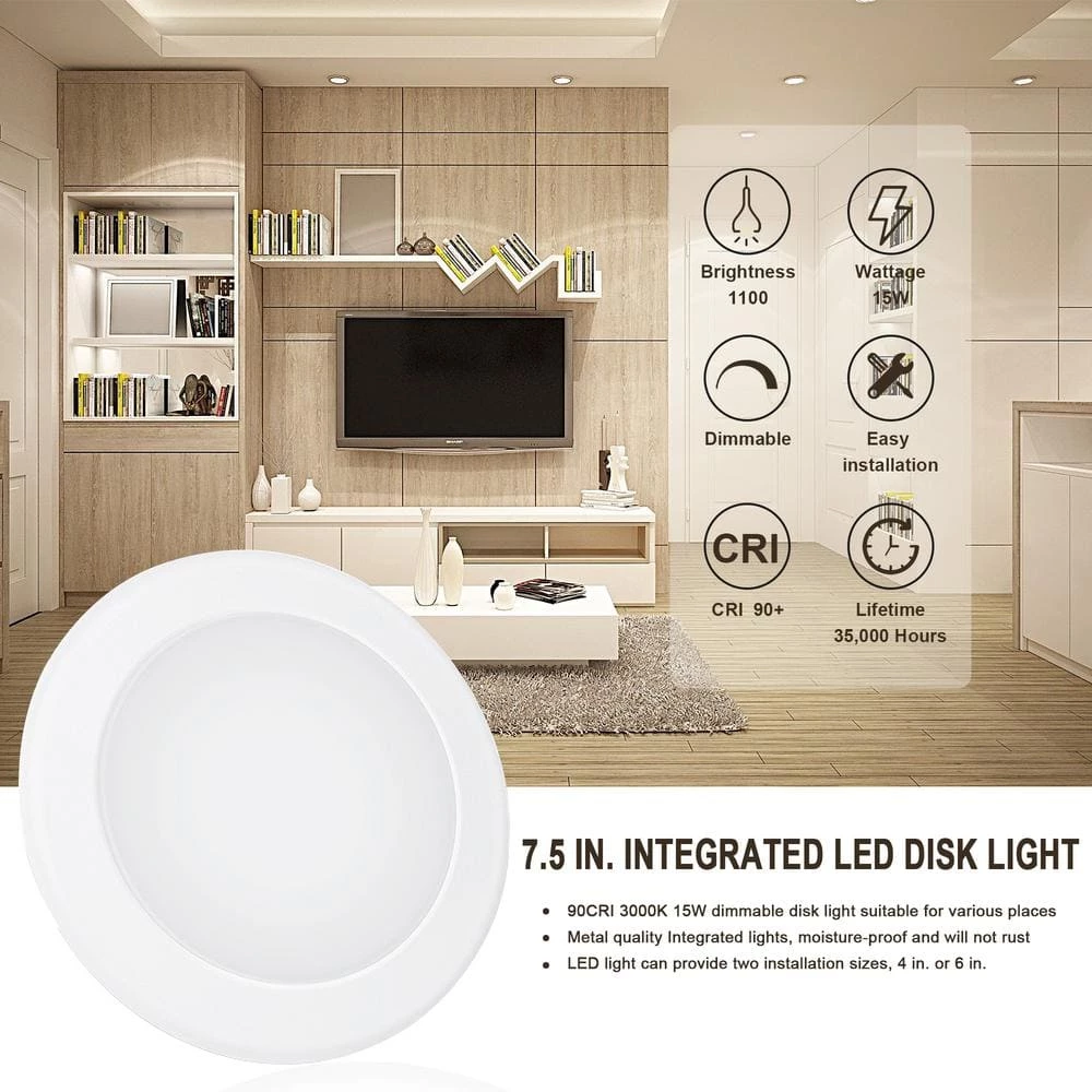 Cedar Hill 7.5 in. integrated LED disk light 15-Watt can support both 4 in. or 6 in. junction boxes and recessed can mount. Dimmable 0% to 100% smooth dimming, compatible with most dimmers, the light would meet various needs in applications such as closets, kitchens, hallways, doorways, basement and so on. 7.5 in. metal shell protects corrosion and rust prevention.