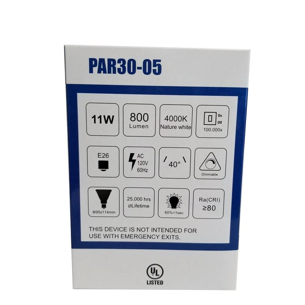 These 11-Watt PAR30 LED lamps can be used for both indoor and outdoor locations including, recessed downlighting, security lighting, landscape lighting and more. They are equivalent to 75-Watt traditional PAR30 bulbs. They are up to 90% energy savings. For damp location.