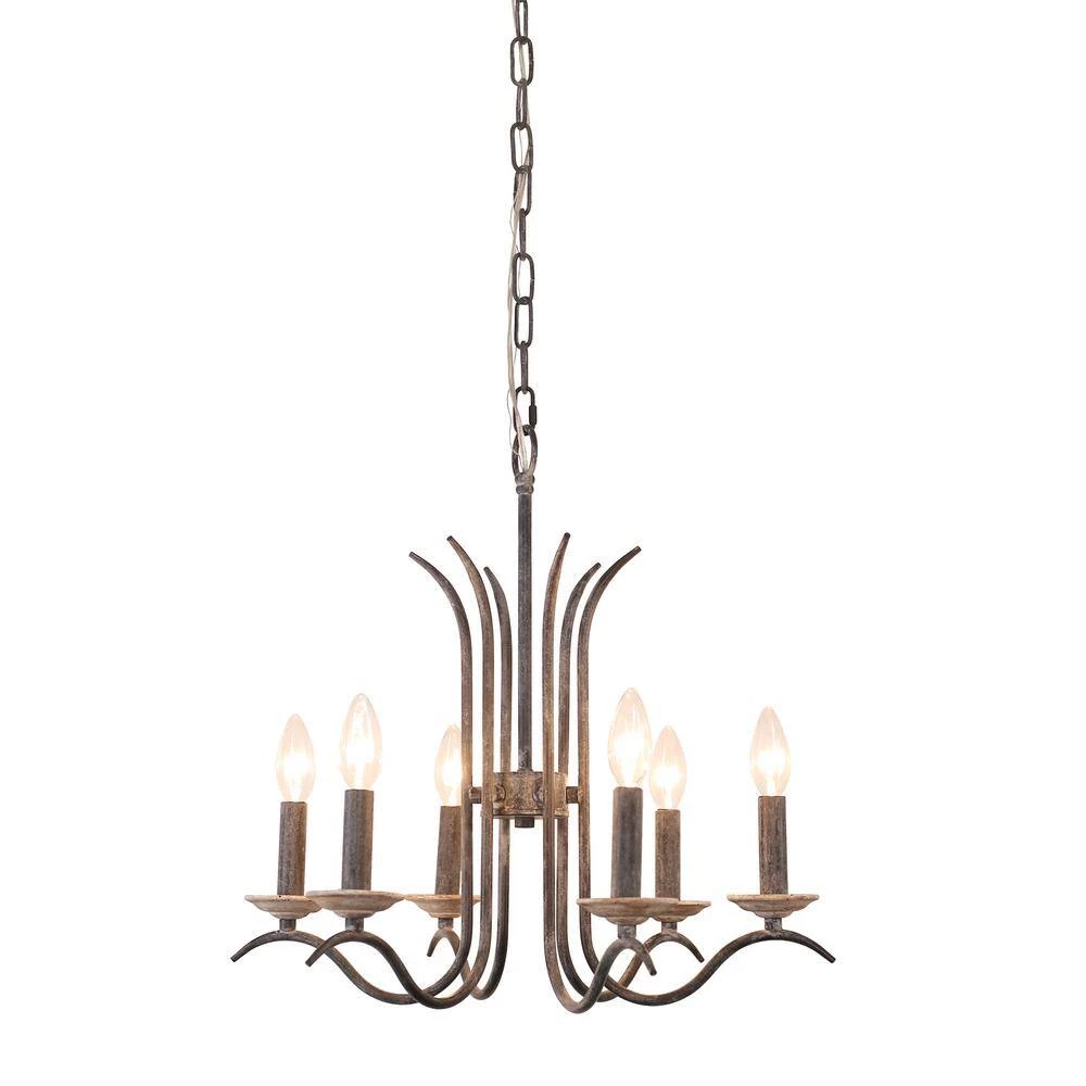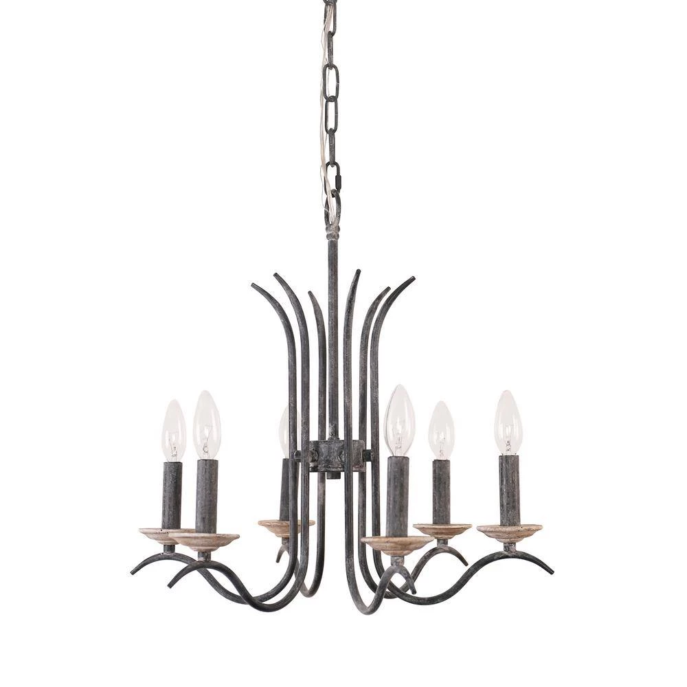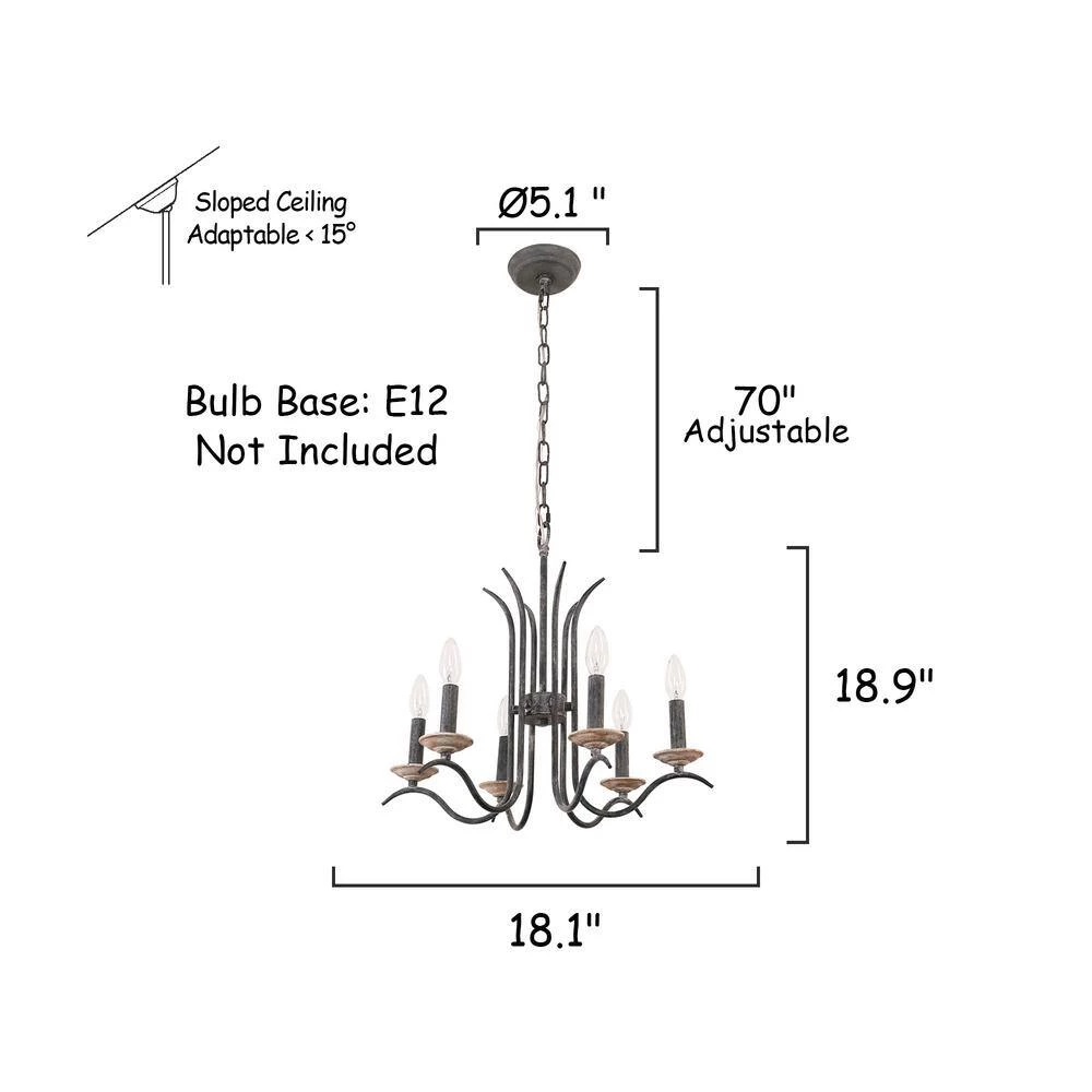 This empire wooden chandelier surrounded by antique black finish candlestick with metal linear frame inside adds a glamorous farmhouse style to your home. Featuring 6 curving arms holding up candelabra base, it spreads brilliant illumination throughout your space. Provided with an adjustable chain, this chandelier is the best choice for your daily use with a decorative design element.