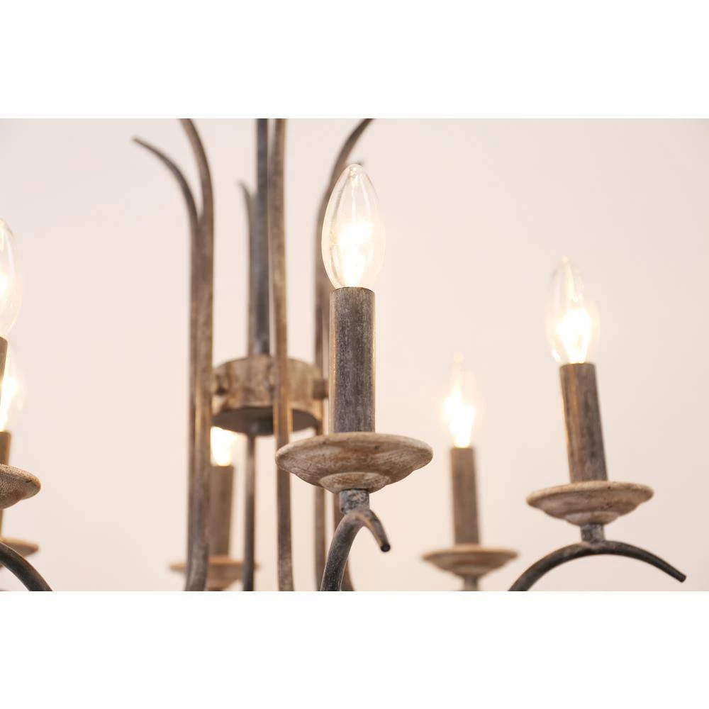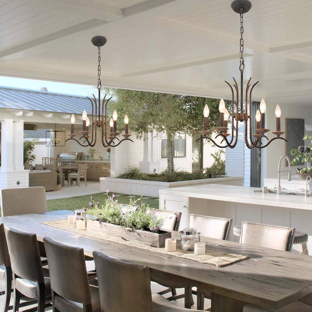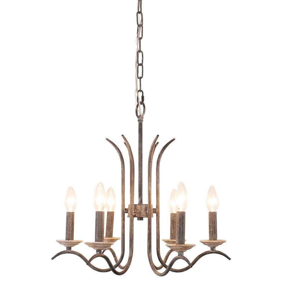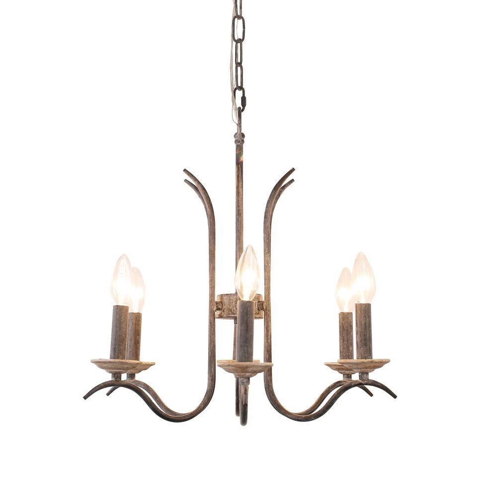 This empire wooden chandelier surrounded by antique black finish candlestick with metal linear frame inside adds a glamorous farmhouse style to your home. Featuring 6 curving arms holding up candelabra base, it spreads brilliant illumination throughout your space. Provided with an adjustable chain, this chandelier is the best choice for your daily use with a decorative design element.